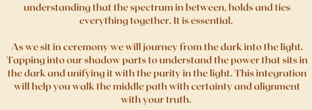 AS we sit in ceremony we will journey from the dark into the light. Tapping into our shadow parts to understand the power that sits in the dark and unifying it with the purity in the light. This integration will help you walk the middle path with certainty and alignment.