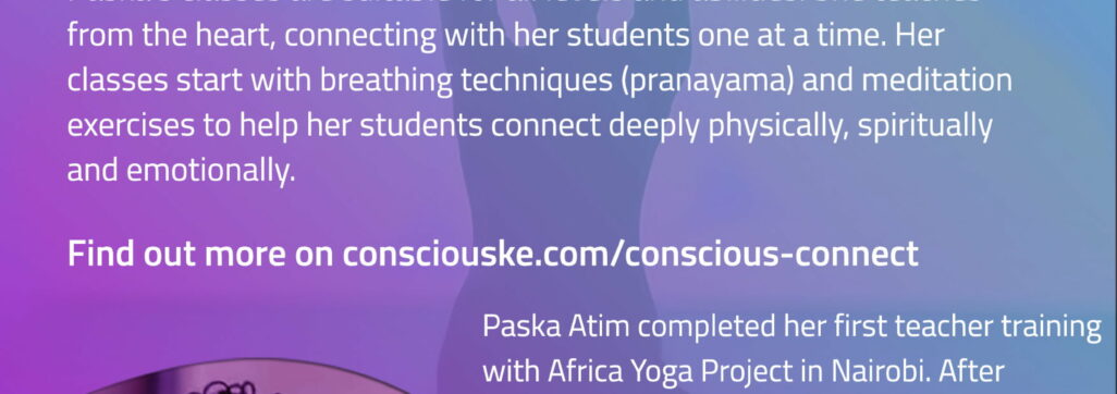 Paska’s classes are suitable for all levels and abilities. She teaches from the heart, connecting with her students one at a time. Her classes start with breathing techniques (pranayama) and meditation exercises to help her students connect deeply physically, spiritually and emotionally.
